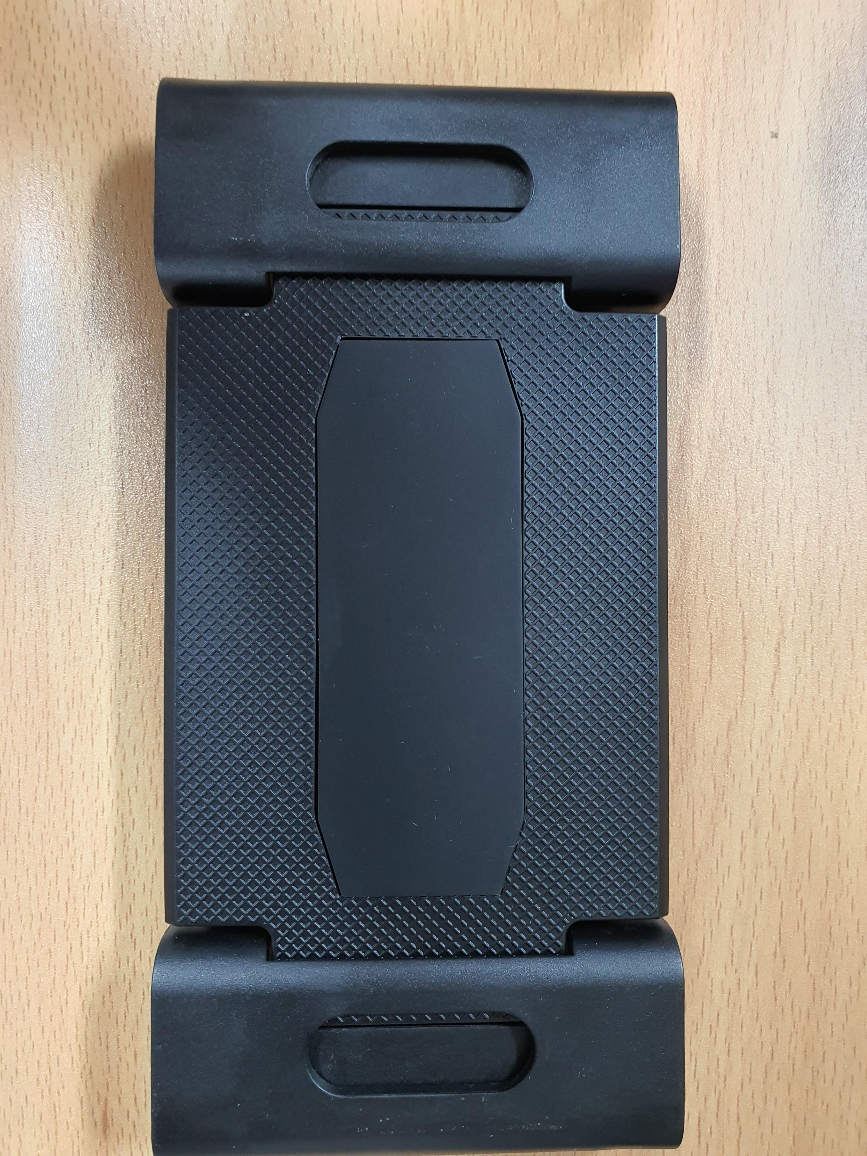 거치부 앞부분입니다. 고무로 되어 있어 미끄러지는걸 일부 방지합니다. 양쪽 귀퉁이는 접었다 펼 수 있게 되어 있습니다. 그리고 좌우로 늘릴 수 있어서 태블릿을 잡아주는 스프링 장치로 되어 있습니다. 압력은 적당하고, 태블릿을 견고하게 잡아 주었습니다.